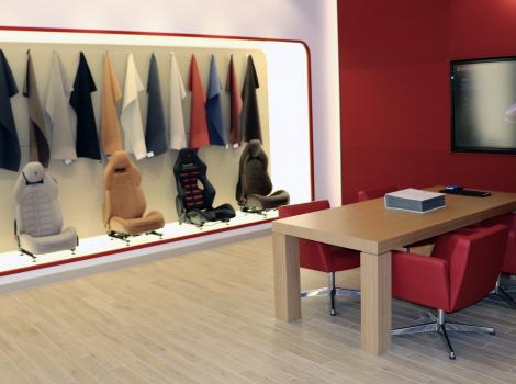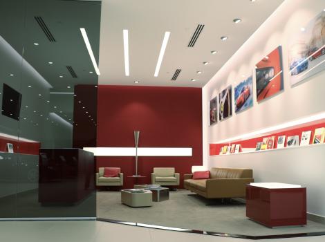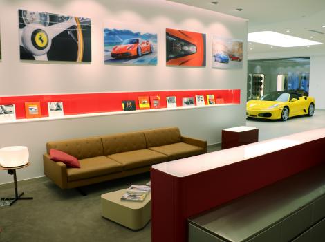 From the second you approach the entrance, you’re welcomed by automatic sliding glass doors unveiling an interior that is as thoughtful as a piece of fine Italian artwork. Creative placement of glass, LED lighting and floating graphics marry the bravado of the showrooms beautiful open landscape with the functional needs defined by three separate niche boutiques. The showroom seamlessly offers guests the ability to design their Ferrari, interact with the latest models or enjoy an espresso on fine leather furniture. From the leather stitching on the chairs to the placement of historic Ferrari memorabilia in the customer lounge, everything has a place and is intended to compliment the iconic Ferrari brand.